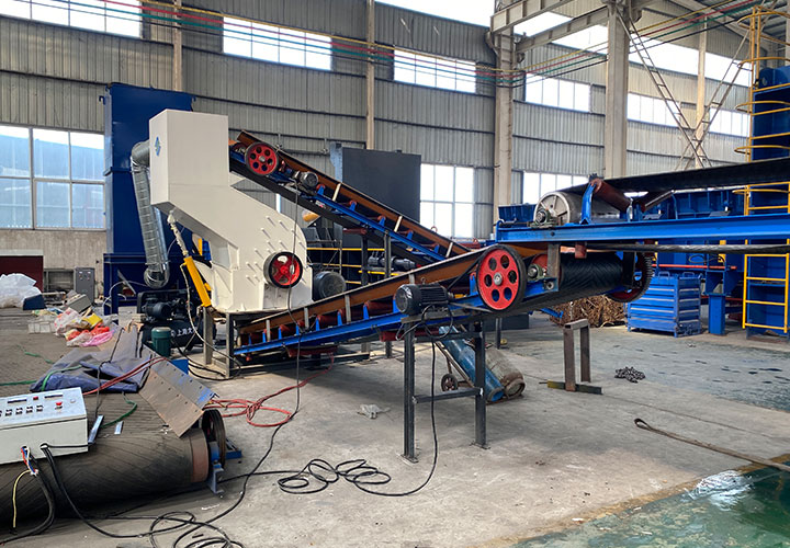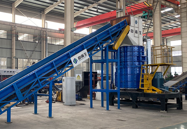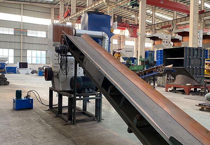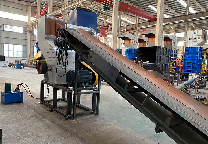 破碎線主機殼體采用特厚鋼板制造,內(nèi)襯為高錳鑄鋼件,可更換;主機轉(zhuǎn)子盤安裝于水平軸上,轉(zhuǎn)子盤圓周分布有銷軸,軸向懸有錘頭;主軸用滾珠軸承支撐,循環(huán)油強制潤滑冷卻,并裝有溫度傳感器;進料口裝有液壓輥筒喂料裝置,位置一高一低,同向旋轉(zhuǎn),能將大件松散物料壓扁,送入破碎腔內(nèi)。